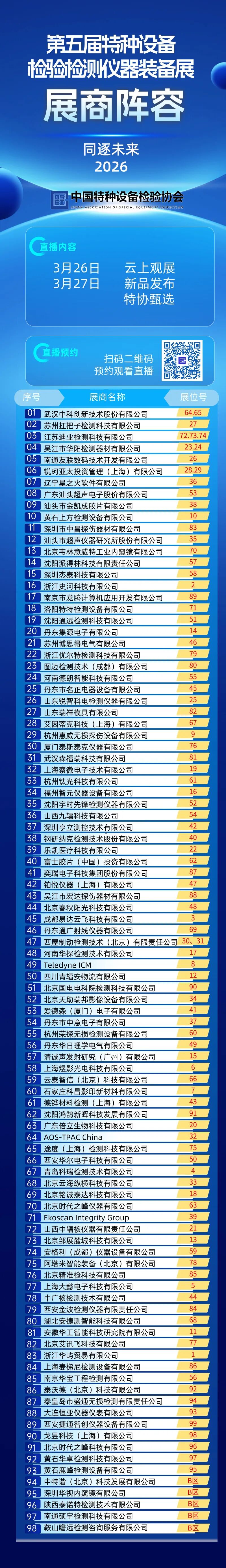 本次展会是国内特种设备检验检测领域规模领先的专业盛会,设置近 100 个展位,此次公布的展商超 98 家,涵盖国内外行业内优质企业。展商业务覆盖探伤器材、超声仪器、工业内窥镜、智能检测装备、影像设备等特种设备检验检测全品类相关产品与技术,实现全产业链资源一站式对接。
